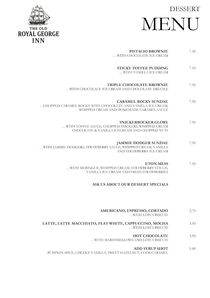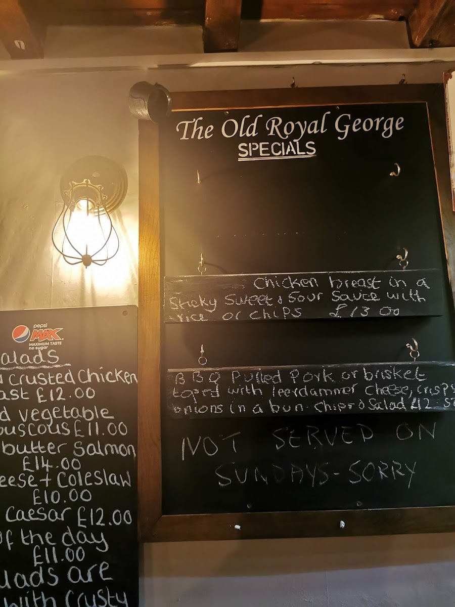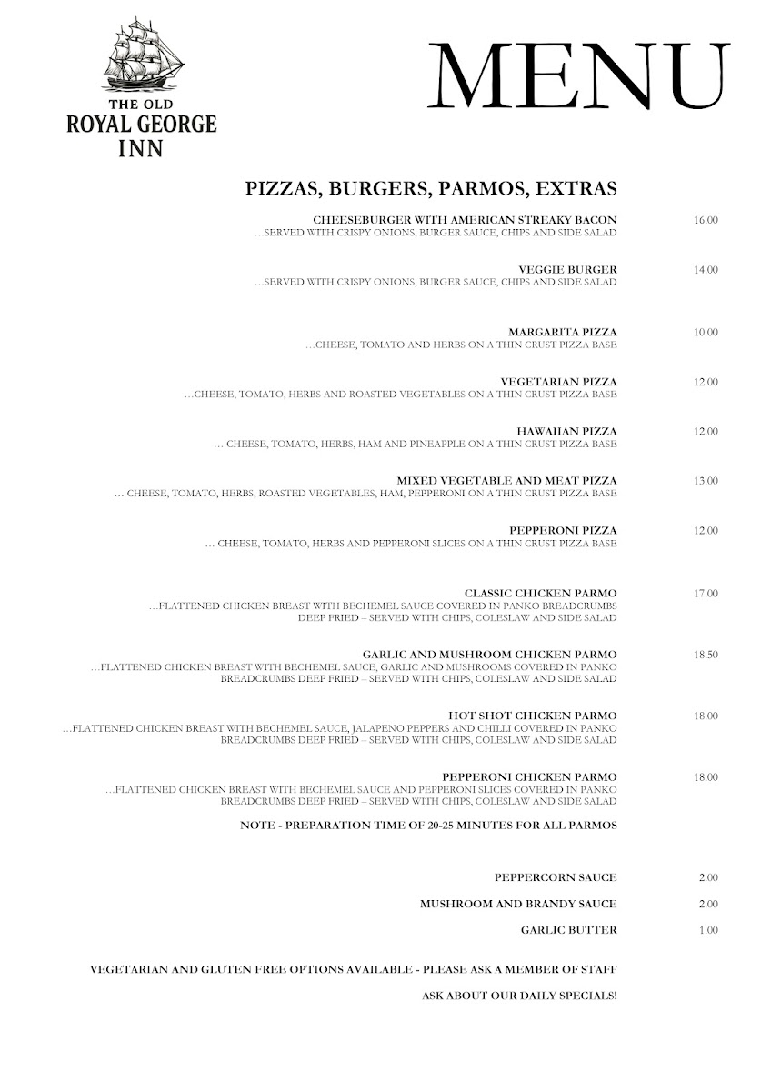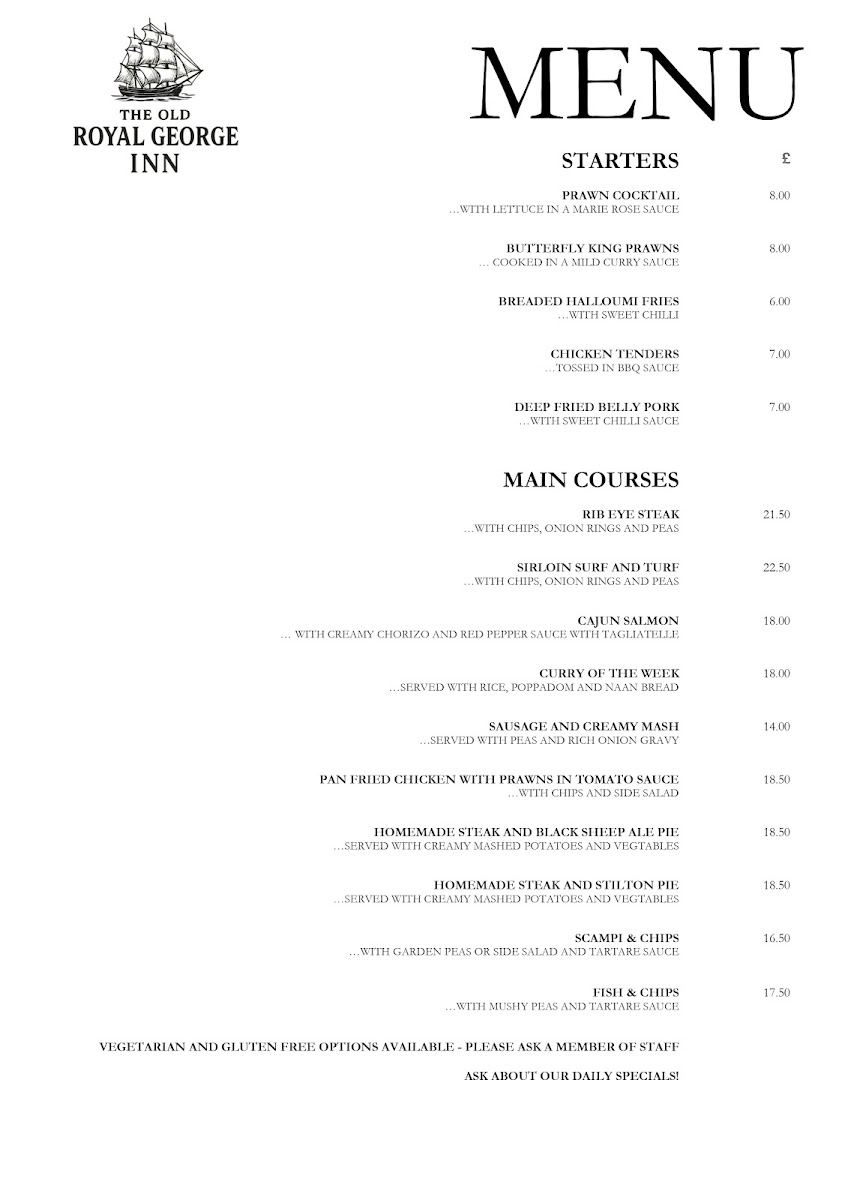 The Old Royal George Inn offers a menu that strikes a comfortable balance between traditional pub fare and thoughtful seasonal dishes. The selection is invitingly straightforward, with hearty classics like steak pie and fish and chips sitting alongside carefully prepared options such as steamed sea bass or vegetable curry. Whether you're stopping in for a casual lunch, settling in for a Sunday roast, or enjoying an evening meal after a day exploring the countryside, the menu reflects the warm and relaxed atmosphere of this countryside pub.